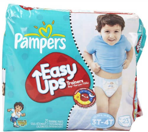 Pampers Easy-Ups Value Pack Diapers for Boys NEW DESIGN! Improved Pampers Easy-Ups train like underwear without the mess! Pampers Easy-ups Trainers are the only training pant with a suspended feel wet liner that still have the absorbency of a diaper...just in case! Designed for easy standing changes, Pampers Easy Ups, our premium pull-on diaper, go on like underwear for the toddler showing signs of potty training readiness. Look for Dora Designs for girls and Diego designs for boys on each Easy Ups pant. At the third stage of development, it can be hard to get a toddler to lie down for a diaper change. Make it easy on both of you with Pampers Easy Ups, a pull-on diaper designed for easy standing changes.
